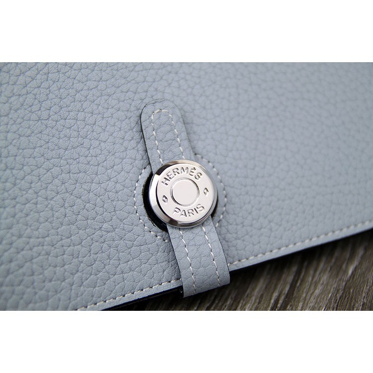 Presenting the Hermes Dogon Wallet. The Dogon Wallet features a leather strap and "Clou de Selle" tab closure. The tab is a circular shape with 'Hermes Paris' engraved on it. This wallet comes from Combined style,which includes a removable zipped coin purse. It has 5 credit card slots, a pocket for bills and 2 extra pockets. The design looks quite easy and our eyes are pointing to the silver plated closure in the center. It is the most convenient way to organize your essentials like your bills, credit cards, coins and more.